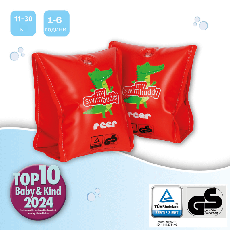 MySwimBuddy - за безопасно изживяване във водата! След като детето ви се научи да плува, във водата се отваря свят на забавления и приключения. Повечето деца обичат да лудуват в басейна и да изпитат освежаващото усещане на водата, което е толкова различно от всичко друго. За да сте сигурни, че плуването е не само забавно, но и безопасно, правилните аксесоари за безопасност при плуване са от съществено значение. Надуваеми плувки MySwimBuddy Те ще се превърнат в най-верния спътник на вашето дете във водата! Изработени от изключително здрав полиестер, с дебелина 0,3мм, мека вътрешна част, плувките са подходящи за деца от 1 до 6 години ( 11 до 30 кг) - за целия период, в който детето ще се нуждае от подкрепа в овладяването на новото умение! Как се ползват: Надуваемите плувки MySwimBuddy на Reer са направени от 2 отделения с вентил и триъгълна форма. Предназначени са за носене само на горната част на ръцете и от деца, които могат да държат сами главата си изправена. За лесна и правилна употреба са нужни само няколко стъпки: Надуйте едното отделение Поставете плувките на ръцете на детето Надуйте второто отд
