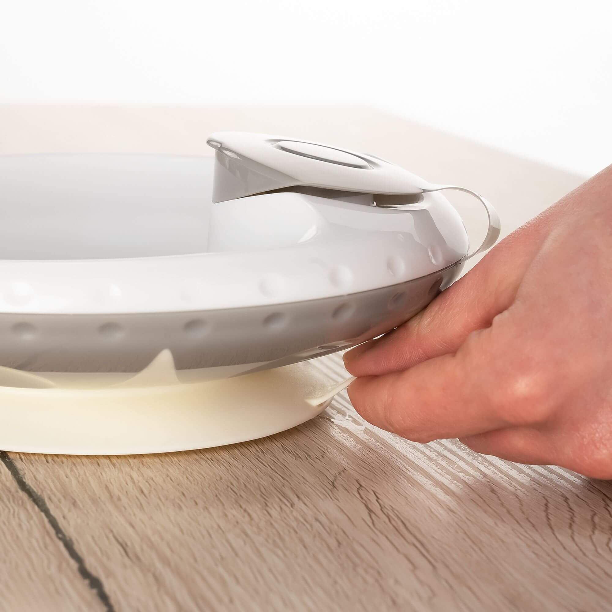 Когато бебето поотрасне, то ще иска да се храни самостоятелно. Отначало тези усилия ще изглеждат повече като битка с кал, но детето ви ще става все по-сръчно с всеки изминал ден. Скоро вашето малко съкровище ще може да използва умело първите си детски прибори. Нечупливите чинии и чаши са необходими не само за първите опити за самостоятелно хранене. Когато бебето расте, то се превръща в малко дете, което знае как да изразява чувствата си. Ако храната не му харесва, може много ясно да покаже недоволството си, като хвърли чинията и чашата и съдържанието им на пода. Тази фаза също приключва, но дотогава съдовете и приборите често ще се озовават на пода. В този преход от мляко в бутилка до самостоятелно хранене подходящите прибори са от важно значение! Тази иновативна затопляща купичка ще поддържа храната вкусна по-дълго време. Така няма да се притеснявате че продължителните самостоятелни опити на малчугана ще развалят вкуса и. А основата тип вендуза ще държат купичката на мястото и за да няма излишно цапане и разливане! Предимства: топлата вода в дъното на чинията запазва ...