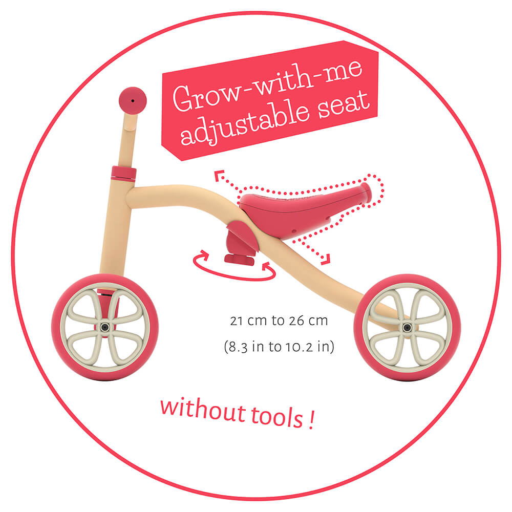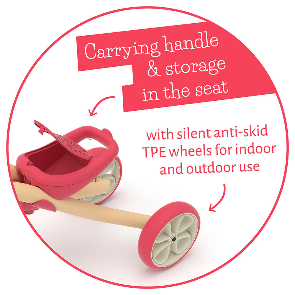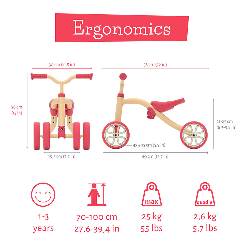 Вижте Quadie перфектната първа играчка за яздене! Със своята солидна, но лека конструкция на 4 колела и стилен дизайн, тя предлага възможност за персонаизиране, лесна е за управление, сигурна и забавна. Седалката се настройва за секунди според височината на детето. Под седалката има малко скривалище за всички съкровища и лакомства. Колелата са изработени от синтетична гума, която не оставя досадни следи по настилките в къщи и гарантира дълготрайна употреба. Забравете за тромавите, грозни играчки за яздене. Quadieе новото любимо малко приятелче за любимото Ви малко съкровище. Височината на седалката се регулира от 21 см до 26 см без нужда от инструменти, а интегрираната в нея дръжка я правят лесна за пренасяне. Предимстава: Изчистен дизайн и солидна метална рамка с лесно маневриране Колелата са изключително тихи, не оставят следи по настилките Подходяща за употреба в къщи и навън. Възраст: 1-3 години Информация за безопасност: Внимание! Сглобяването и настройката на седалката трябва да се прави от възрастен. Винаги проверявайте играчката преди всяка упот