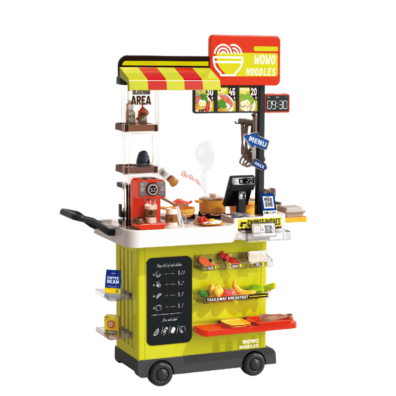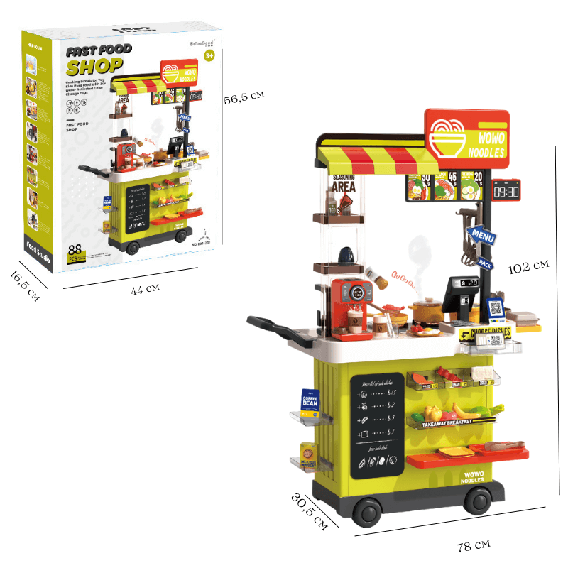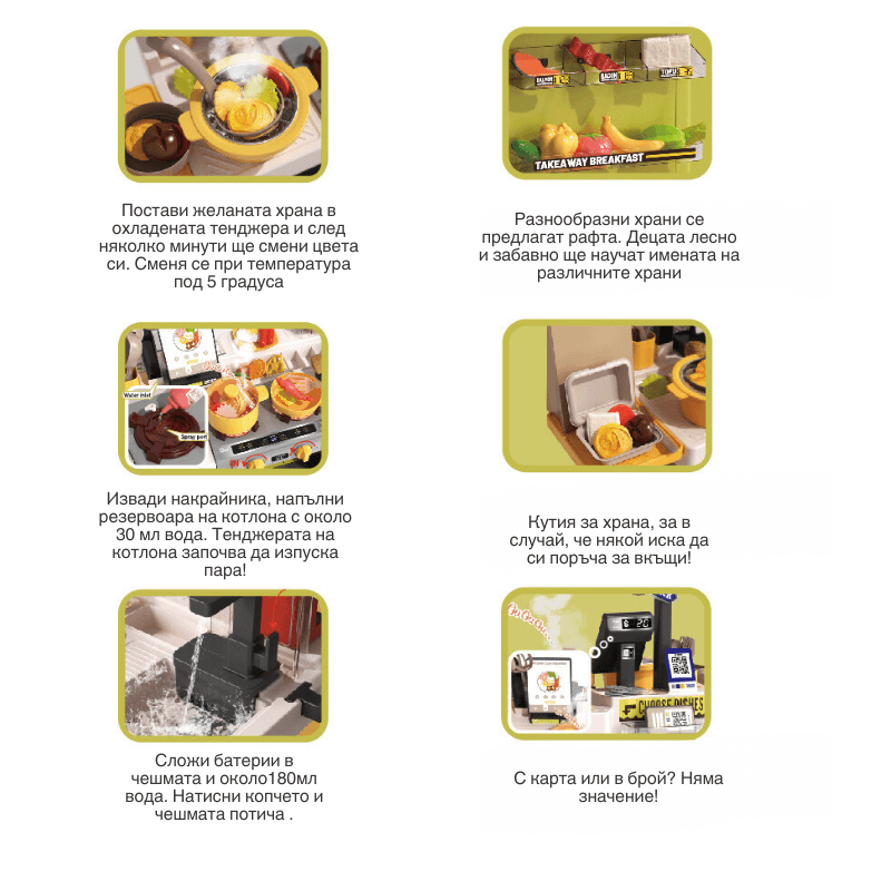 Мултифункционален комплект за игра Fast Food количка Нудълс шоп Новата серия количка за улична храна предлага множество възможности за разнообразна игра, развиване на въображението и фината моторика на децата. Както и участие в ролеви игри. Количката разполага с разнообразни рафтове и поставки, за да можете да направите свой собствен уникален павилион за бързо хранене, включените колелца помагат за лесното преместване - за да можете да играете навсякъде- както у дома, така и навън. Реалистична симулация на готвене - Когато печката е включена, тя издава реалистични звуци и пара, за да симулира истинско готвене. Освен това хранителните продукти имат функция промяна на цвета и сензор за температура. Храната ще промени цвета си, когато температурата на водата е под 5 градуса. Предоставяме на децата по-завладяващо готварско изживяване! Чешмата разполага с истинска течаща вода ( на циркулационен принцип) Играчката е подходяща за деца на възраст 3-5 години. Децата могат да мият храна, плодове и съдове, приготвят храна и напитки и изпълнят поръчката в кутия за вкъщи или на място. С...