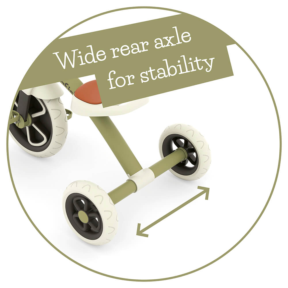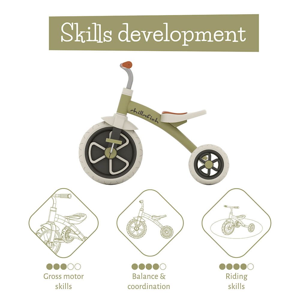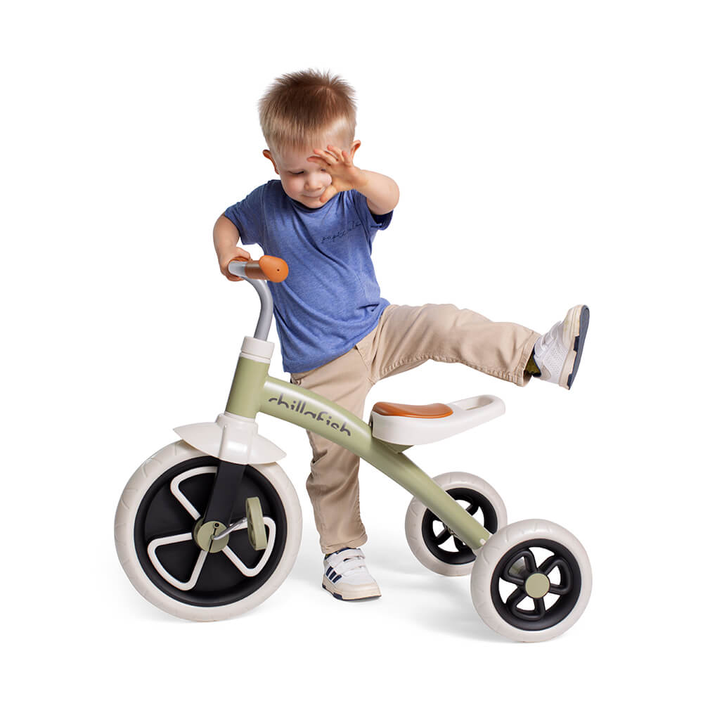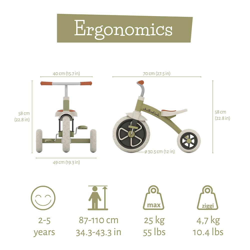 Представяме ви триколката Chillafish Ziggi! Най-добрата играчка за яздене, която съчетава иновативен дизайн с удобни за децата функции За да създаде идеалния спътник за приключенията на вашето малко дете. Проектирана с грижа и прецизност, триколката Ziggi е произведена от висококачествени, издръжливи материали, които гарантират безопасност и дълъг живот. Ziggi се откроява с не натрапчиви, класически цветове - маслиново зелено и фламинго и елегантен дизайн, което я прави привлекателно допълнение към всяка игра или разходка в парка. Здравата рамка на триколката и не плъзгащите се педали осигуряват стабилност и увереност на младите изследователи, като насърчават независимостта и развитието на двигателните умения. Безопасността е от първостепенно значение! при разработването на триколката Chillafish Ziggi. Оборудвана със стабилно междуосие и плавни гуми, той предлага сигурно возене по различни терени, докато лесното за хващане кормило позволява лесно управление. Триколката Ziggi не е просто играчка; това е внимателно изработено превозно средство, което е от полза за физическо