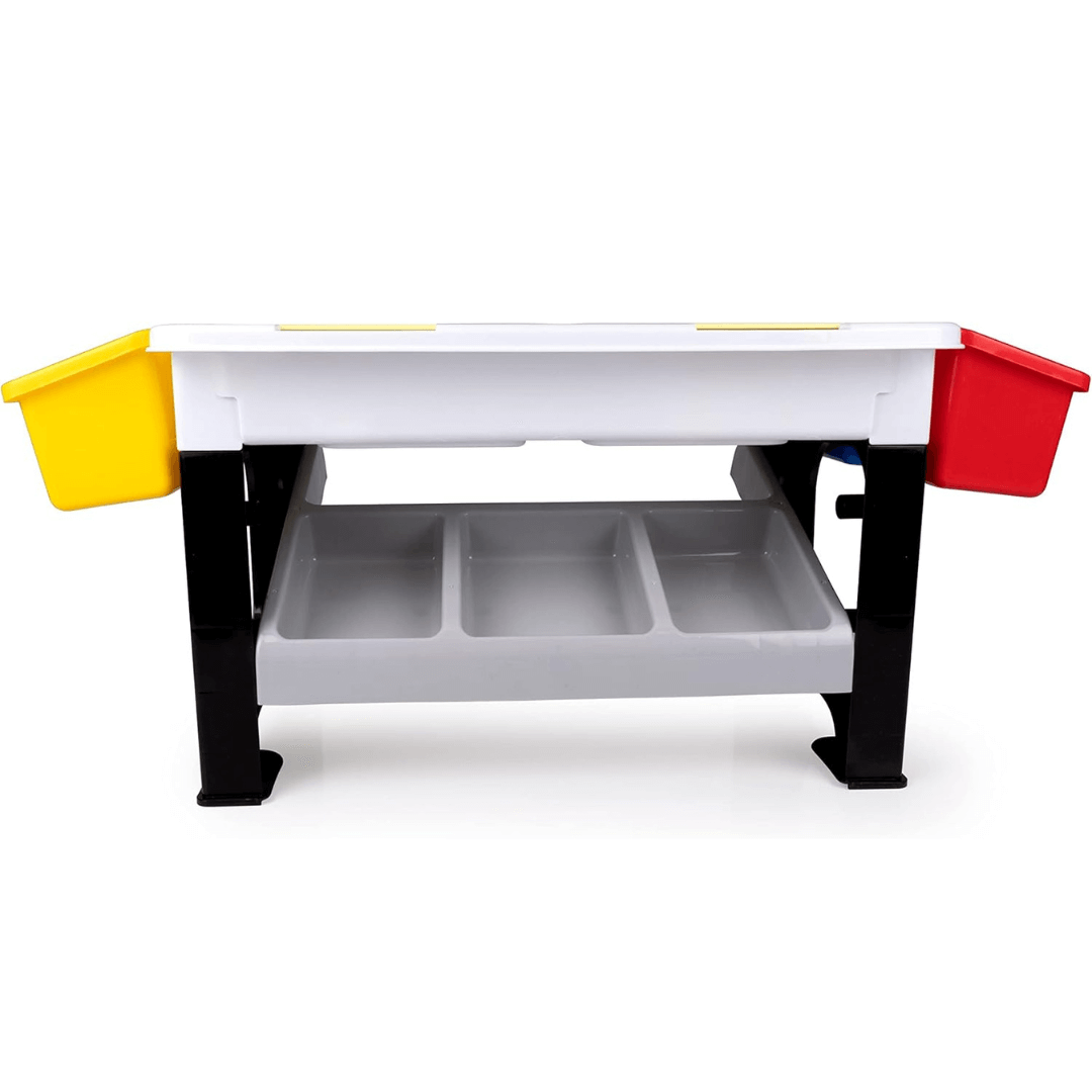 Класически за игра със строителни тухлички, който ще даде на децата безкрайни часове забавление при строителство! Това е комплектът конструктор с маса на EDDY TOYS. Строителни тухлички са с множество цветове, форми и размери, заедно с маса с множество кутии/отделения за съхранение и голяма строителна повърхност, осигуряват на децата перфектното пространство за игра, забавление с въображението и лесно и сигурно съхранение на всичко на едно място! ИГРАЧКА С УМЕЛО ВЪОБРАЖЕНИЕ – Освен забавлението, този комплект за игра със строителни тухлички е чудесна дейност за стимулиране на малките умове и развиване на умения. От разпознаване на цветове, числа и форми, практическата дейност по строителство и конструиране дава на децата възможност за творческо учене, решаване на проблеми, координация между ръцете и очите, критично мислене и може би дори малко инженерство за малки деца, докато строят и разглобяват! КОМПЛЕКТ от 300 + елементи с маса и специални кошове за блокчетата включва: МАСА ЗА ИГРА - Масата за игра също се сглобява лесно чрез щракване. Когато е сглобена, масата е