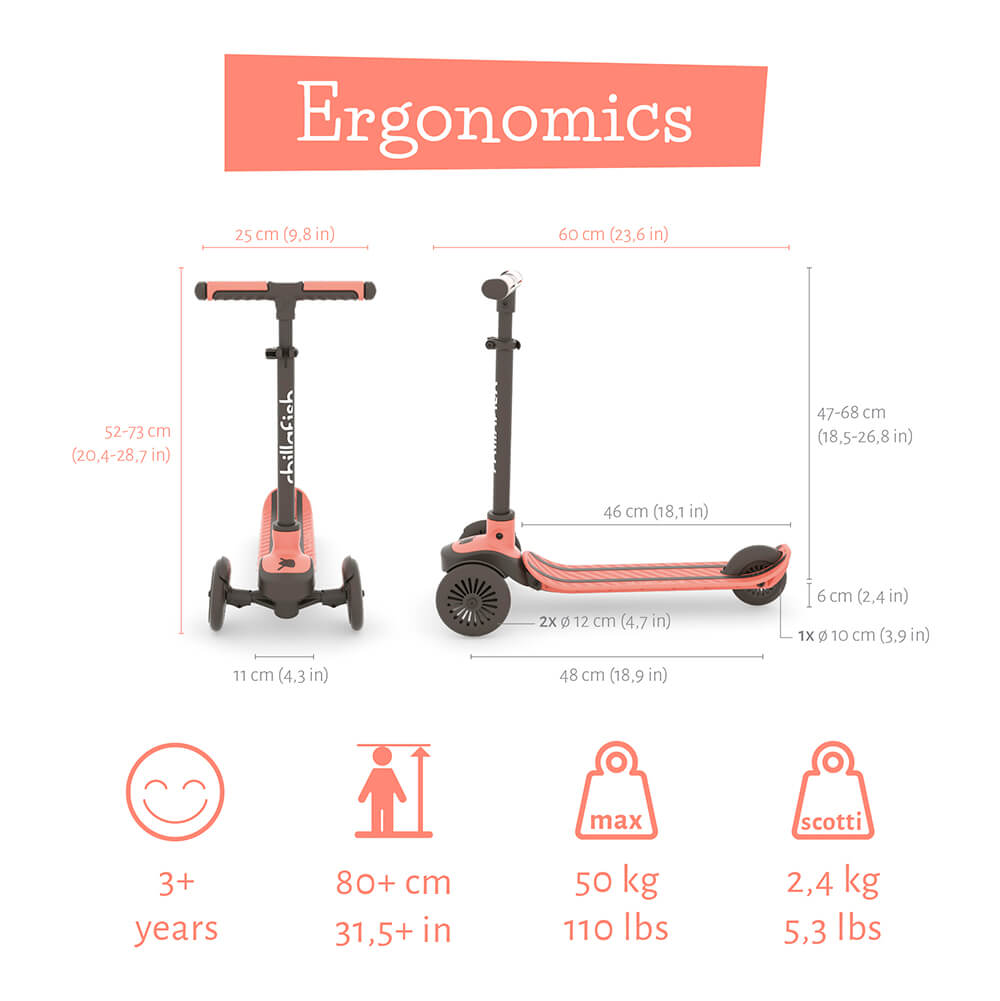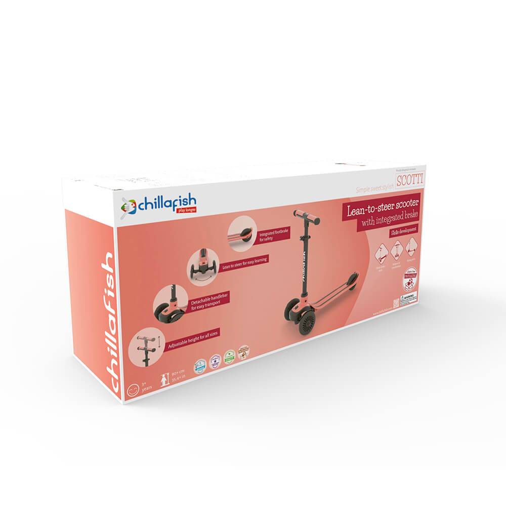 Scotti е интерпретацията на Chillafish на класическата тротинетка с 3 колела. Тази лека тротинетка за деца над 3 години е възраждане на тротинетката с накланяне, като в допълнение се отличава с емблематична за Chillafish двойна палуба с вградена спирачка. Кормилото се сваля с щракване без инструменти, така че можете лесно да вземете Scotti със себе си при приятели или в парка. Височината се регулира лесно и ще е подходяща за малки и по-високи деца - диапазонът му е от 52 см до 72 см (от земята). Висококачествените колела ABEC-5 ви карат да се возите така, сякаш никога няма да спрете, а удобните дръжки създават усещане, сякаш никога няма да искате да ги пуснете. Основата е лека, но здрава, за деца и възрастни до 50 кг (но е тествахме повече :-)). Scotti, лека, семпла, стилна, забавна, качествена от Chillafish. За да играете по-дълго! Спецификация: Регулиране на височината: 52-72 см За деца над 3 годишна възраст (80+ см) Тегло: до 50 кг Тегло на тротинетката: 2,4 кг Размери на продукта: Д=60 см, Ш=25 см, В=52-72 см. Информация за безопасност: Внимание! Сглобяването и настройката на седалката трябва да се прави от възрастен. Вин...