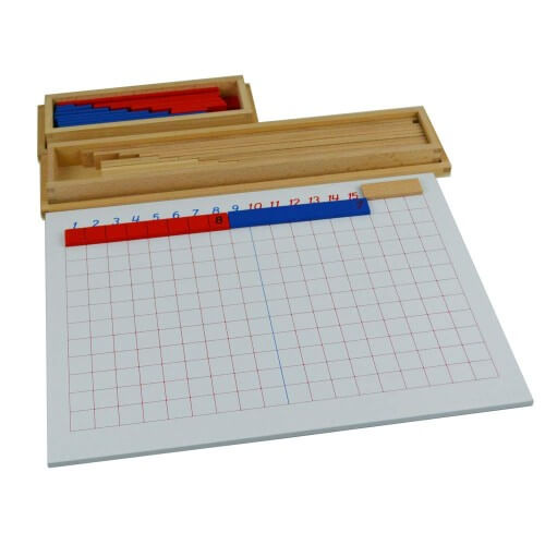 Комплектът се състои от:- бяла разграфена дъска - 2бр;- кутийка със сини и червени летви;- кутийка с дървени летви.Заниманията с този материал помага на децата да усвоят основните математически действия събиране и изваждане посредством дървени цветни летви.Размер на кутията: 35,5х28,5х8,5, тегло: 1кг.Подходяща за деца над 4,5 години.Може да прочетете за заниманията с червените летви тук.На сайта на Smart Baby ще откриете много образователни Монтесори материал и играчки.