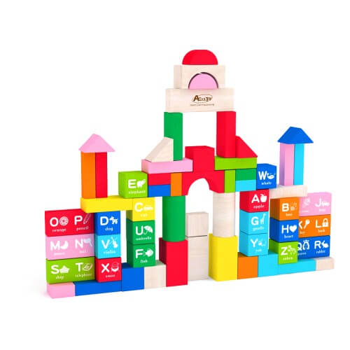 Дървена играчка конструктор, която се състои от 60 разноцветни дървени блокчета. На някои от тях има написана буква от английската азбука, дума започваща със съответната буква и картинка.Всички елементи на конструктора са прибрани в кофа с капак. На капака има изрязани дупки съответно с формите на различните елементи на конструктора. Всеки елемент може да мине през съответната дупка на капака и да влезе в кофата.Играта развива вербално-езиковите способности на децата, уменията им да четат и произнасят думи на английски език, а картинките към тях им помагат по-лесно да научат тяхното значение. Развива се логическото мислене и фината моторика, също така се изгражда умение за концентрация и търпение.Тегло: 1,2кг. Подходящо за деца над 18 месеца.
