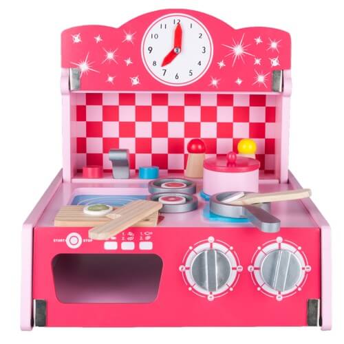 Малка сгъваема дървена кухня с мивка, два котлона, фурна и шкаф. В комплекта още се съдържат:- четири двустранно нарисувани с продукти плочки;- солници;- дъска за рязане;- дървена шпатула и ножче,- тенджера с капак;- тиган;- две чинии.Кухнята е с размери 10х30х30 см и тежи 2,9 кг.Кухнята е подходяща за деца над 3 години.