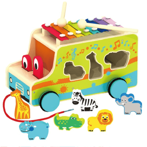 Многофункционална дървена играчка с размери: 24х14х16 см.Дървен автобус с колелета. От двете страни на автобуса има изрязани дупки, в които могат да се поставят точно определени различни животни. На покрива му има ударен музикален инструмент - ксилофон с метални пластини. А при движение на автобуса, очите му се местят.Играчката развивa по забавен и интересен начин, моториката и координацията на движенията на детето. Както и логическото мислене и пространственото взаимодействие по време на игра. Опознаването на различни животни и техните имена. Освен това ксилофона развива усещането за ритъм и любовта към музиката.Подходящо за деца над 18 месеца.Тук може да прочетете повече за интересни занимания с мъниците. А в магазина на Smartbaby ще откриете отлични предложения за образователни Монтесори материали и играчки.
