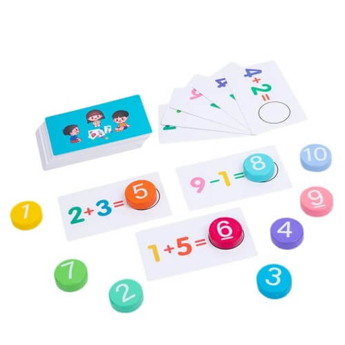 Чрез заниманията с тази игра, децата ще се опитат да решават математически задачи с действията събиране и изваждане.Комплектът включва:дървени кръгли плочки с числата от 1 до 10 - 10 бр;двустранни карти с различни задачи за събиране и изваждане - 46 бр.Вземете карта и прочетете задачата, помислете и изберете дървена плочка с число, което смятате, че отговаря на отговора.Проверете с възрастен дали той е рправилен.Чрез заниманията с този продукт, у децата се развиват моториката и сръчността на ръцете, координацията на движенията между очите и ръката, а също и концентрация, логическото мислене и запознаване с числата и основите на математикатаРазмери на кутията: 16.5х11.5х3см.Тегло: 150гр.Първите занимания с този продукти, са подходящи за деца между 3 и 7 години,.Още много Монтесори материали, свързани със сензорното развитие, математика или околен свят, можете да намерите на линка.Smart Baby предлага качествена литература за малки и големи, Монтесори материали и играчки, дрехи и качествена българска козметика.