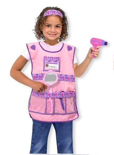 Подходяща възраст: 3+ Размер на опаковката: 59,7 см x 43,2 см x 3,6 см Материал: Текстил и пластмаса Комплектът съдържа: 6 части (престилка, сешоар, гребен, ножици, лента за коса и пластмасово огледалце) Батерии: 2 х ААА Батерии включени в комплекта: Не Време за доставка: Един работен ден
