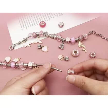 Подходяща възраст: 6+ години Материал: Метал и пластмаса Размери: 9,5 см х 9,5 см х 5 см Комплектът включва: декоративна чанта, куфарче, 3 гривни, 3 верижки, 20 кръгли висулки, 20 плоски висулки, 20 висулки фигурки Време за доставка: Един работен ден