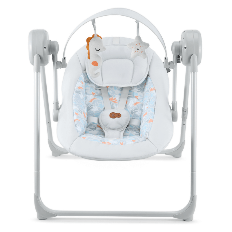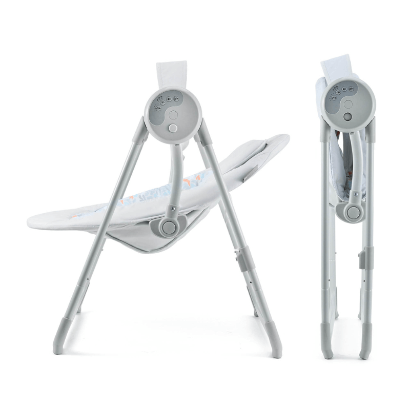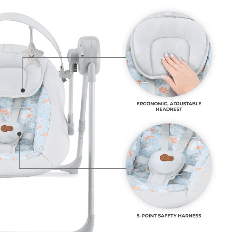 Основни характеристики SWINGEE може да служи като класически шезлонг или електрическа люлка с автоматично люлеене. Едно универсално решение, което се адаптира към ежедневния ритъм на бебето. SWINGEE разполага с 3 начина на захранване– чрез електрическата мрежа, пауър банк или батерии. 5-степенно регулиране на люлеенето с таймер Функцията за люлеене ви позволява да избирате от 5 нива на скорост, за да отговарят на нуждите на вашето бебе. Таймерът (8, 15 или 30 минути) завършва сесията автоматично, поддържайки ритъма на бебето. SWINGEE разполага и с 8 вградени мелодии, 3 от които звуци от природата. Лек, сгъваем дизайн С тегло от само 3,7 кг и проста система за сгъване, SWINGEE е перфектен както у дома, така и на почивка. След като се сгъне, заема изключително малко място, което го прави идеален за съхранение и транспорт – чудесен за активни семейства. Безопасност и комфорт Ергономичната, регулируема облегалка за глава и 5-точковият колан с меки подложки осигуряват стабилна опора и безопасно позициониране. Вашето дете може да почива комфортно и безопасно – независимо дали се люлее или лежи непод