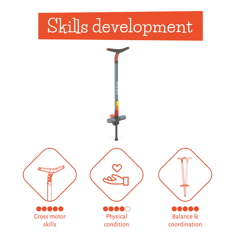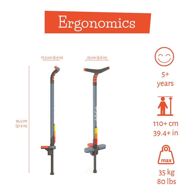 Chillafish Poogi GLOW за деца е стик за скачане, проектиран със забавни допълнителни предизвикателства. Можете ли да правите подскок с 1 ръка? Или на 1 крак? Този забавен стик за скачане има централизирана допълнителна стъпенка и ергономична ръкохватка, за да изпробвате упражнения с една ръка или с един крак. Колкото по-високо скачате- толкова повече ще свети, благодарение на LED светлините в стика! Предизвикайте себе си за допълнително забавление! Упражнявайте баланс, като преминавате от два крака на един! И след това се опитайте да пуснете и ръка, стъпка по стъпка. Универсалната мека ръкохватка е проектирана за една или две ръце. Пого стикът е проектиран с неуморна здрава пружина вътре в тръбата, която ще ви държи в движение завинаги. Той е чудесен за развитие на грубата моторика и физическа подготовка. Предизвикайте приятелите си и скачайте възможно най-високо! Спецификация: Поги стик kids: за 5+ години Ръст: 110+ см Максимално тегло: 36 кг Размери: 95,5 х 17,5х 25 см/ 2,5 кг Доставя се сглобен. Информация за безопасност: Подходящо максимално натоварване 36 кг! З
