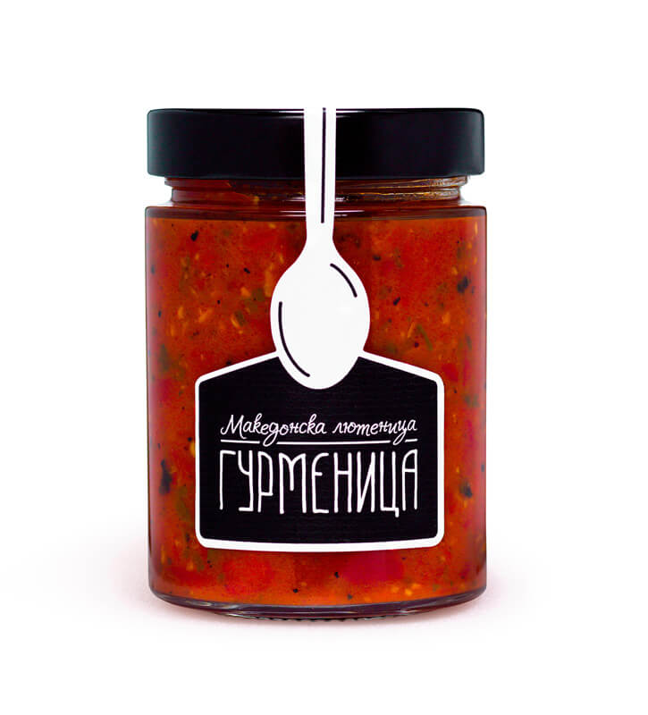Гурменица Македонска лютеница се приготвя от печени червени чушки, доматено пюре, слънчогледово олио, захар, чесън, магданоз, сол. Гурменица дължи прекрасния си вкус на висококачествените зеленчуци, които подбира.